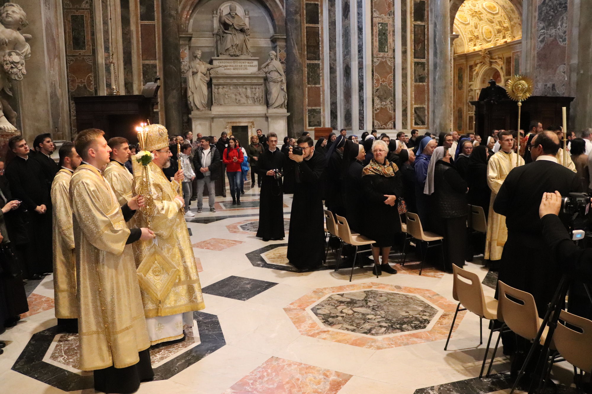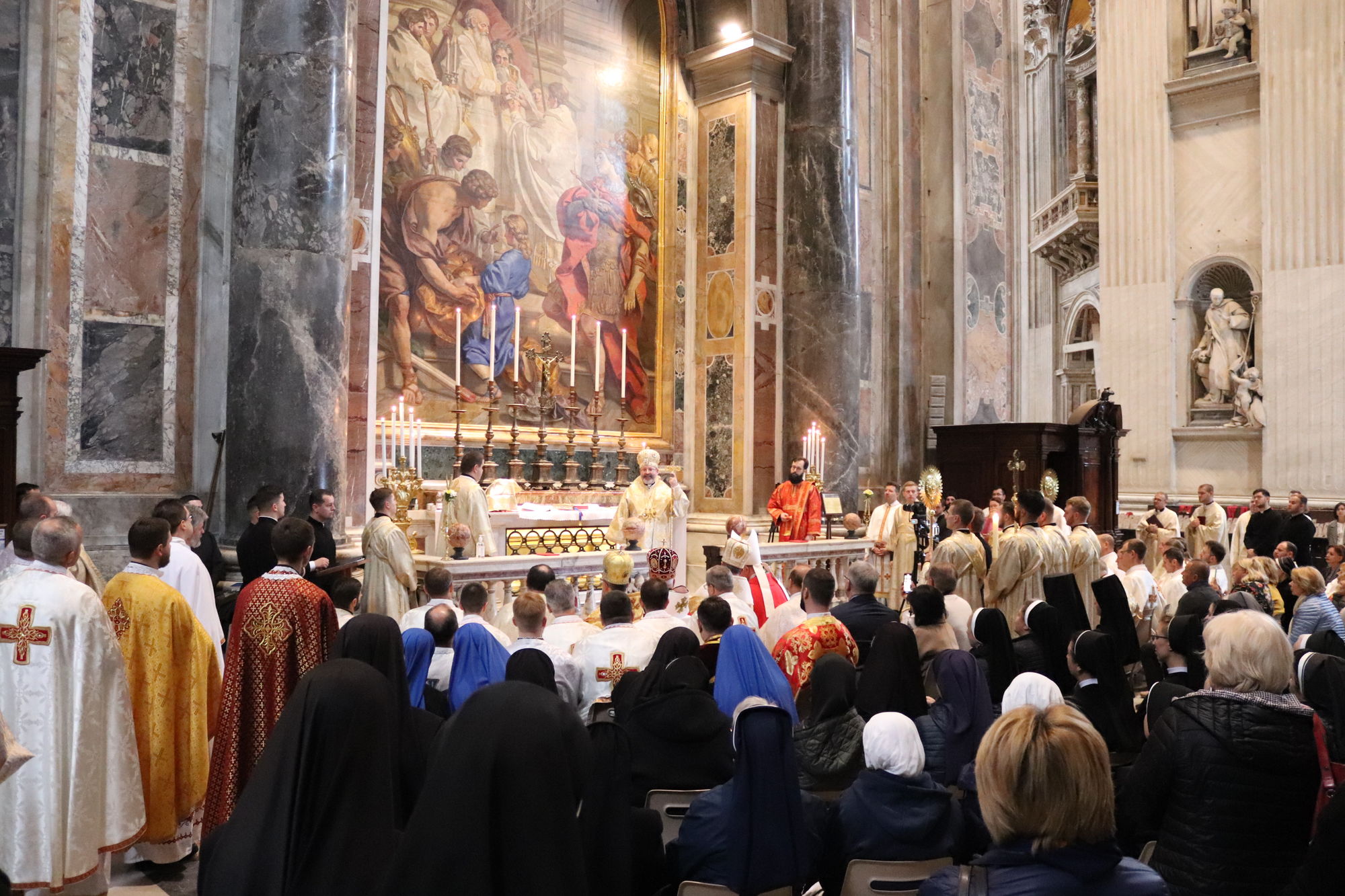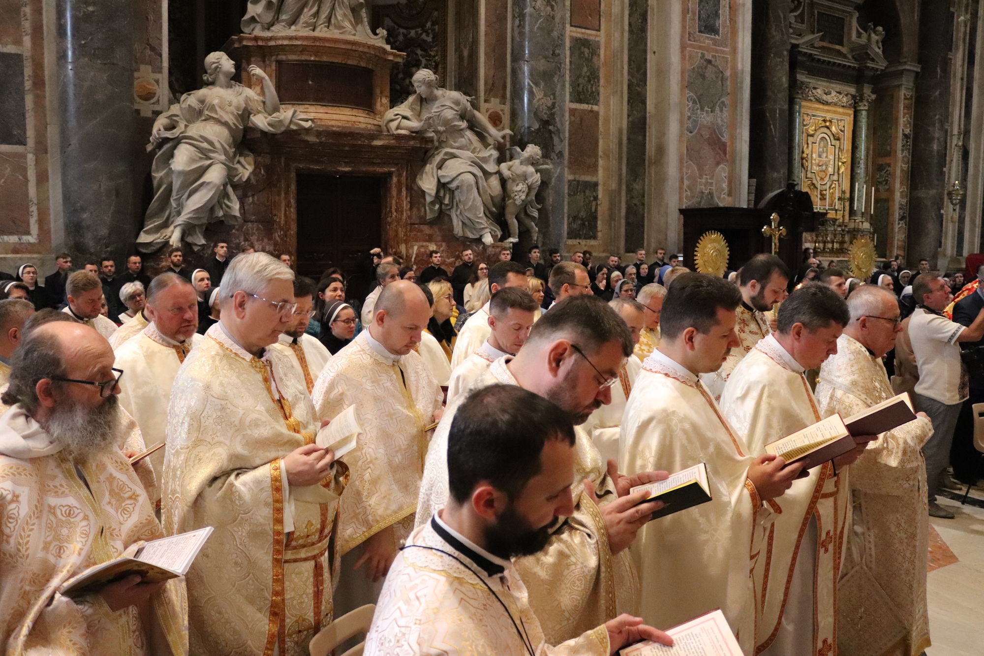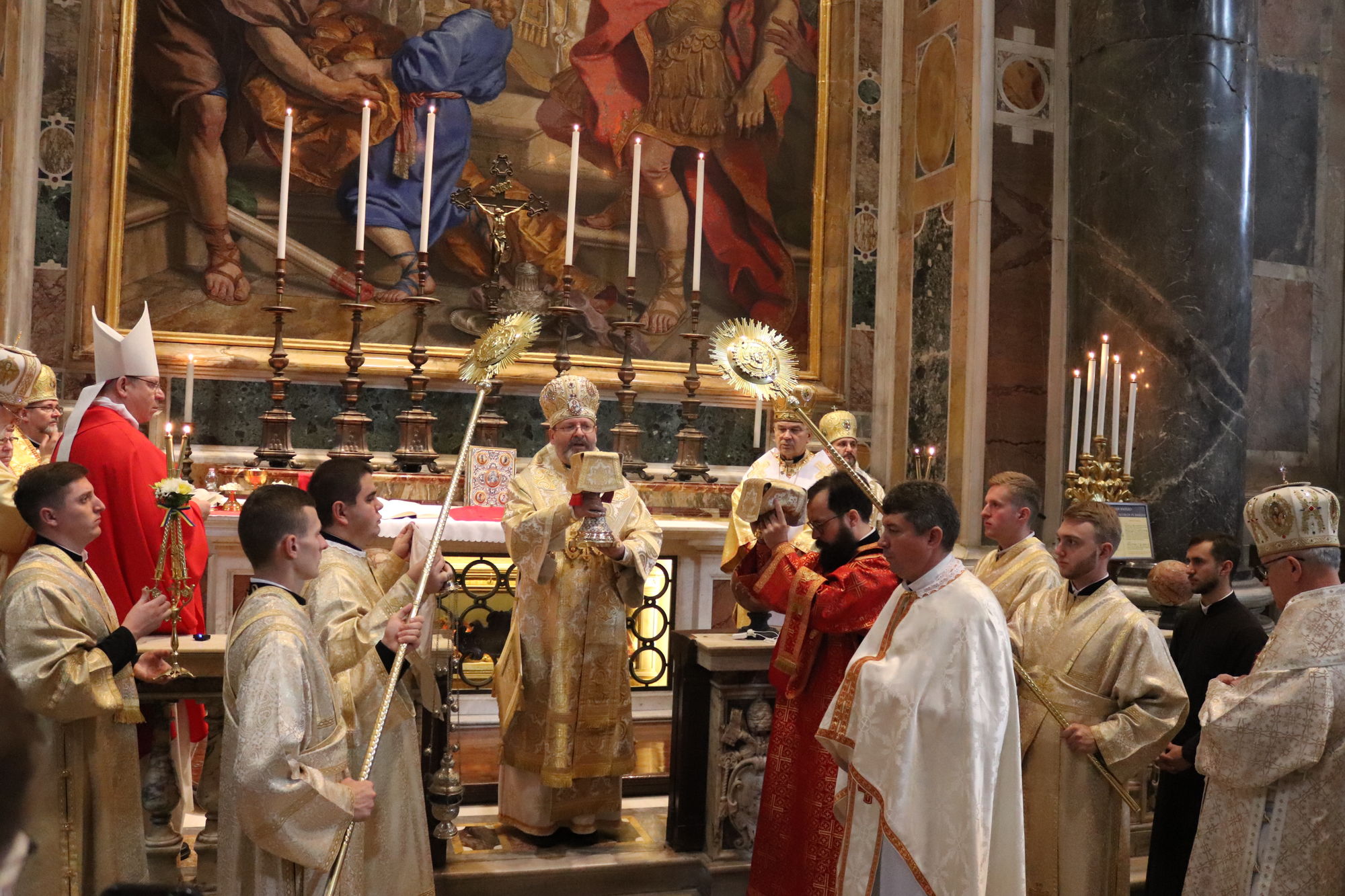 З Главою Церкви співслужили єпископи УГКЦ: владика Борис Ґудзяк, архиєпископ і митрополит Філадельфійський, владика Діонісій Ляхович, апостольський екзарх в Італії, владика Михайло Бубній, екзарх Одеський, владика Богдан Дзюрах, апостольський екзарх у Німеччині та Скандинавії, владика Іриней Білик, канонік Папської базиліки Санта Марія Маджоре, а також владика Юрій Джуджар зі Сербії і владика Ґінтарас Ґрушас, архиєпископ Вільнюса, де святий Йосафат звершував у монастирі своє служіння. Участь у молитві взяли монашество, семінаристи та миряни УГКЦ.