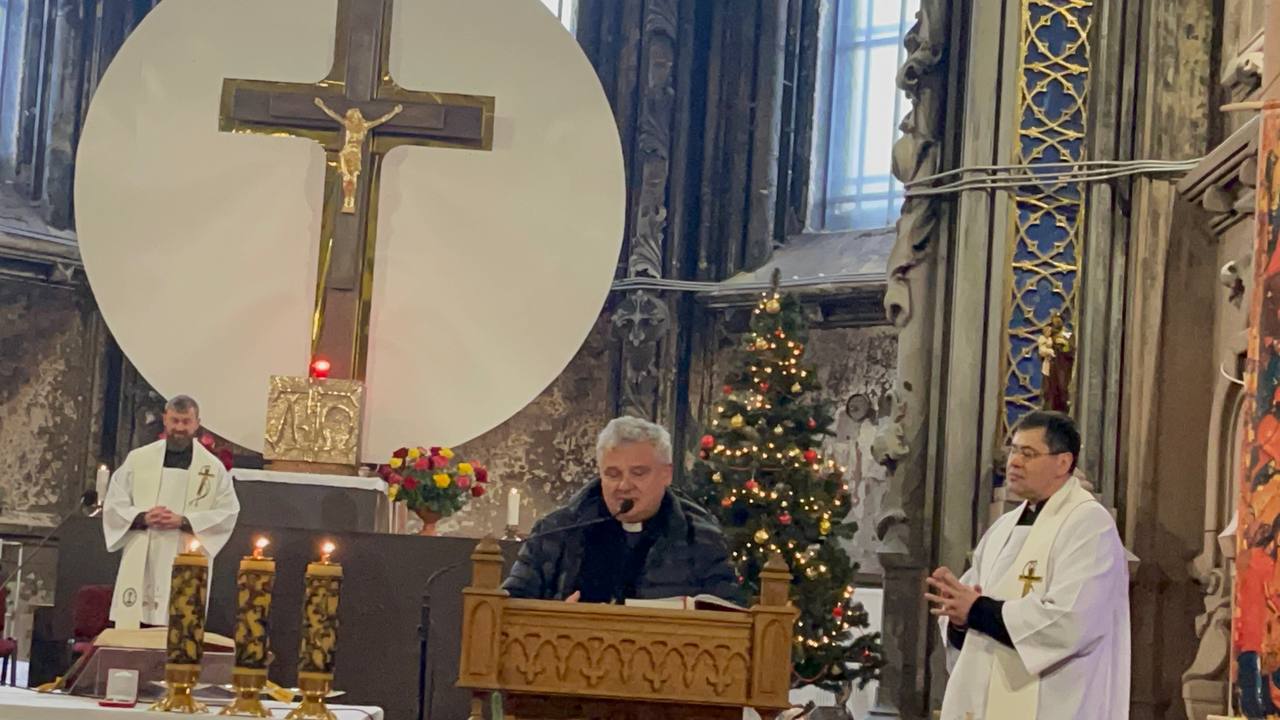 «Сьогодні під час Служби Божої до нас завітали високі гості: Його Еміненція кардинал Конрад Краєвський, який в черговий раз привіз до України матеріальну та духовну підтримку від Папи Франциска, та Його Високопреосвященство Апостольський Нунцій в Україні Вісвальдас Кульбокас. Посланець Святішого Отця кардинал Конрад Краєвський вже вп’яте в часі війни привозить до нашої країни так потрібні українському народу речі. На цей раз – це термобілизна та генератори. Відвідування так зайнятими особами нашого храму, дуже знакова для нас подія. Ця подія ще раз підкреслює те, що ми не самі, що Папа про нас пам’ятає, що цілий світ разом з нами. Дуже зворушливо те, що кардинал Краєвський разом з вітанням від Папи передав нам і його Розарій – головну зброю християн. Цей Розарій разом з іконою Божої Матері Остробрамськоі буде мандрувати нашими домівками. На ньому будемо молитися разом з Марією. Чому з Марією? Тому що Марія, як сказав кардинал Краєвський, не тільки народила Божого Сина, а й сама стояла під хрестом. Саме Вона найбільше знає, що таке терпіння, що відчуває людина, втрачаючи найближчих. Разом з Нею будемо молитися за віддання нашого храму, за мир в Україні та цілому світі».