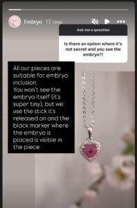 «Наша місія — запропонувати сім’ям гарний спосіб вшанувати цей розділ їхньої історії, перетворивши ці ембріони на вироби, які поза часом, які можна плекати вічно», — продовжується опис, опускаючи той факт, що життя було зруйноване заради кулона-сувеніра чи іншої ювелірної прикраси.