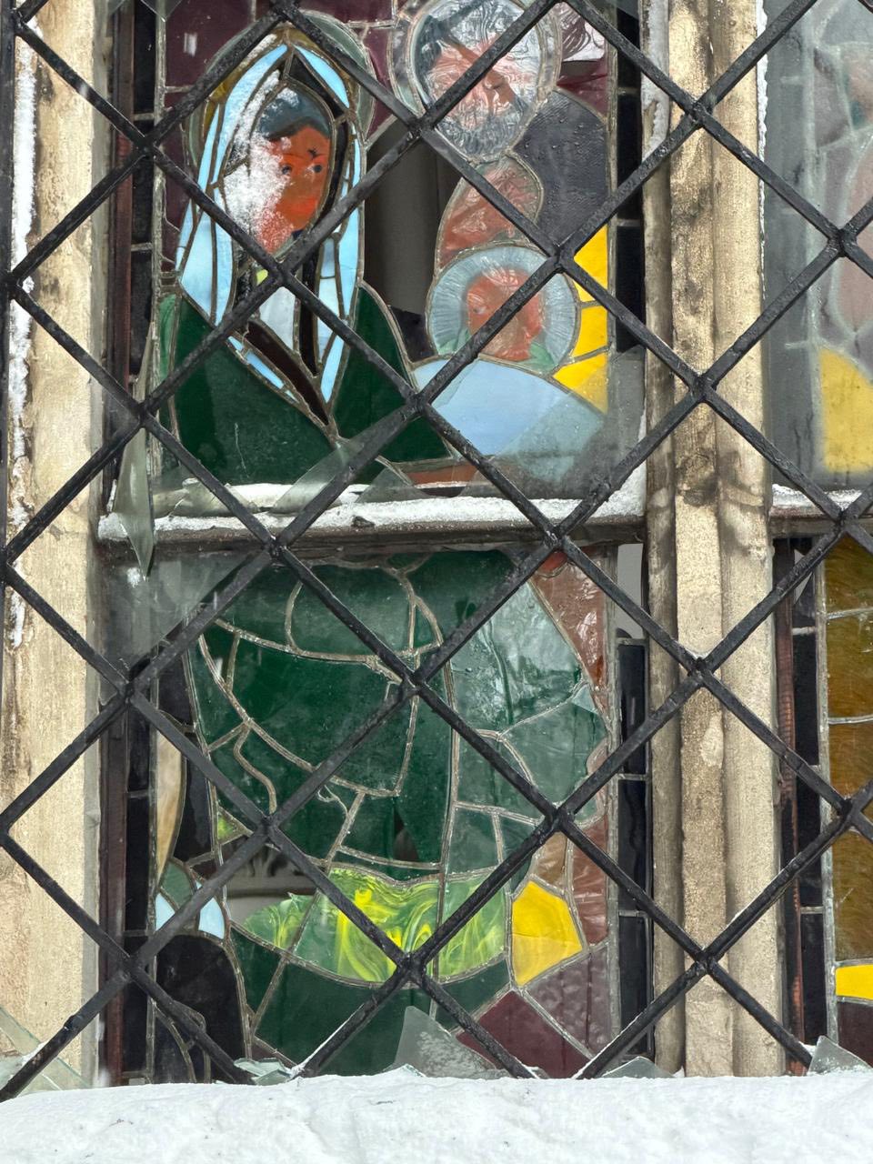 Пошкоджені вітражі авторства Валерія Шаленка у церкві (на фото), а також віконні заповнення у будівлі школи.